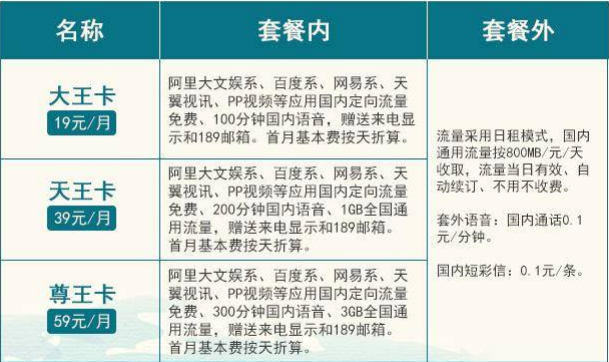 电信大王卡,套餐月费19元,套餐包括100分钟国内语音 阿里大文娱系、百度系、网易系、天翼视讯、PP视频国内定向流量免费。